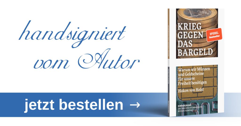 - Krieg gegen das Bargeld: Verlag Hintergrund, Graefenstraße 19, 10967 Berlin, hom@buchkomplizen.de.